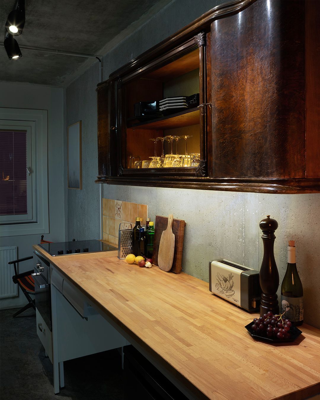 design for a studio kitchen with seating accommodation for morning coffee in solitude